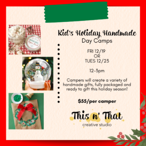 Kids Holiday Handmade Day Camp Holiday Handmade Day Camp Give your child the joy of creating ... 19 Dec 12:00 pm - 3:00 pm