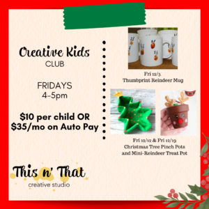 Creative Kids Club Introducing Our Creative Kids Club! What: Creative Kids Club When: Fridays, 4:00 PM ... 12 Dec 4:00 pm - 5:00 pm