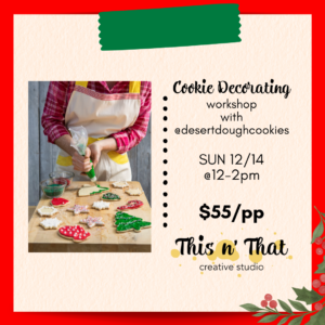 December Cookie Decorating Workshop Join us on Sunday, December 14th at 12:00 PM for ... 14 Dec 12:00 pm - 2:00 pm This 'n' That Creative Studio1066 S. Pantano Rd, Tucson, AZ 85710