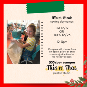 Winter Break Sewing Day Camp Get ready for a fun and festive afternoon of creativity ... 19 Dec 12:00 pm - 3:00 pm This 'n' That Creative Studio1066 S. Pantano Rd, Tucson, AZ 85710