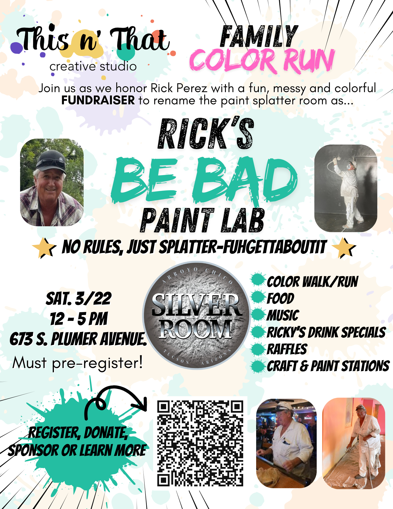 Help us honor Rick Perez with a fun, messy, and colorful fundraiser to rename the Paint Splatter Room at This n’ That Creative Studio as “Rick’s Be Bad Paint Lab”—a space where creativity runs wild, and the only rule is: No Rules, Just Splatter – Fuhgettaboutit!