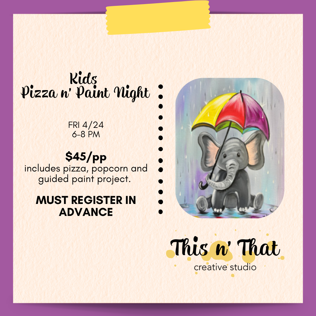 Drop the kids off for a fun-filled evening of creativity and connection! Our Pizza n’ Paint Night includes pizza, popcorn, and a guided painting session in our paint room. Ages 5+