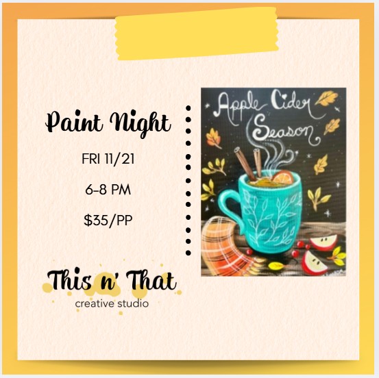 Join us for a cozy and creative evening at This n’ That Creative Studio on Friday, November 21st from 6–8 PM! Sip warm apple cider, enjoy light refreshments, and unwind as you paint a charming fall-inspired scene — perfect for the season. Whether you’re a beginner or an experienced artist, our instructor will guide you step-by-step to create your own masterpiece.