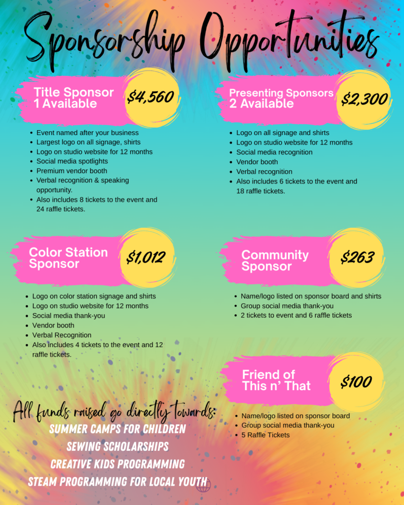 This year, our goal is to triple or even quadruple our impact. Funds raised from the Color Run will directly support STEAM education, summer camps, early literacy initiatives, and teen job training programs at This n’ That Creative Studio. This includes hands-on STEAM and sewing learning, affordable and scholarship-based summer camps, free story time events that promote early literacy, and meaningful job training opportunities that help teens build confidence, responsibility, and real-world skills.